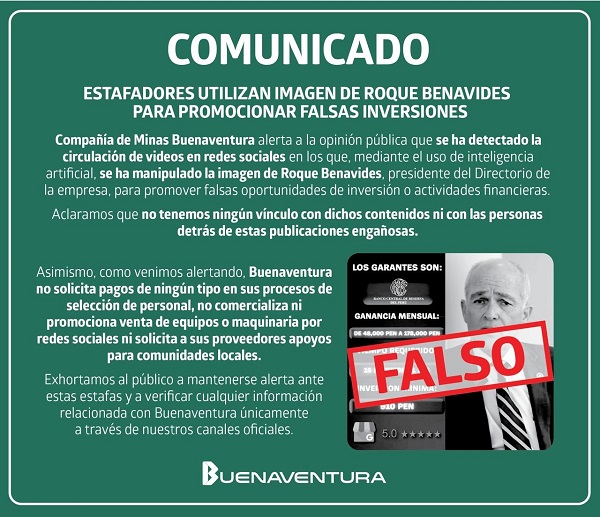 Compañía de Minas Buenaventura alerta a la opinión pública que se ha detectado la circulación de videos en redes sociales en los que, mediante el uso de inteligencia artificial, se ha manipulado la imagen de Roque Benavides, presidente del Directorio de la empresa, para promover falsas oportunidades de inversión o actividades financieras.